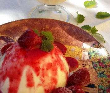 6. Gotowy deser polać sosem, udekorować malinami i listkami melisy lub mięty.
